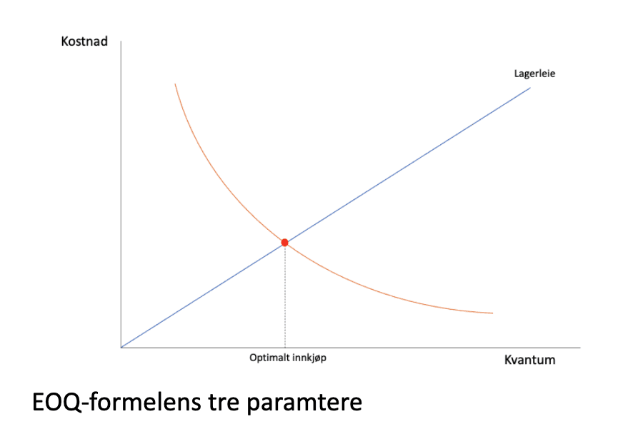 Det optimale innkjøpsvolumet finner du i skjæringspunktet mellom lagerkost (som stiger med innkjøpsvolum) og transaksjonskost per ordre (som synker med innkjøpsvolum).